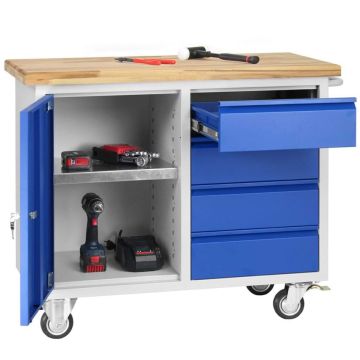 Mobilier d'atelier comme des armoires métalliques, des établis et des sièges techniques d'atelier.